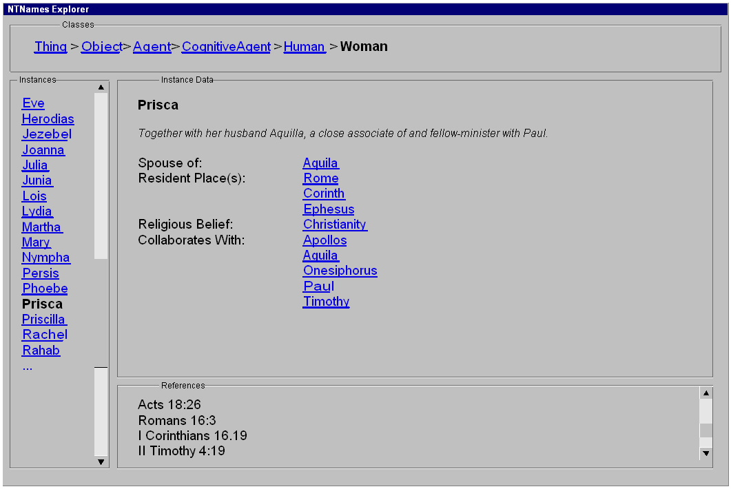 - the attributes and relationships for a particular instance of a name (in the example below, the woman Prisca)