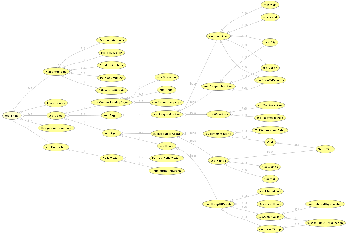 NTN is represented in OWL, the Ontology Web Language which was recently released as a W3C recommendation. OWL in turn is built on RDF, and expressed in XML. If you look at the NTN data with a text viewer, you'll see a dismaying number of angle brackets, pound signs, and other notation. While the file is technically readable text, it's not very understandable unless you know about OWL, RDF, and XML: it's really meant for processing by program. Most people will want to view it using special editors like Protege that understand OWL and provide a more friendly interface (be sure to get the OWL plug-in) . Here's a screenshot of (most of) the classes, and some of the instances of the Woman class, displayed in Protege. This (large) diagram shows the whole class structure.